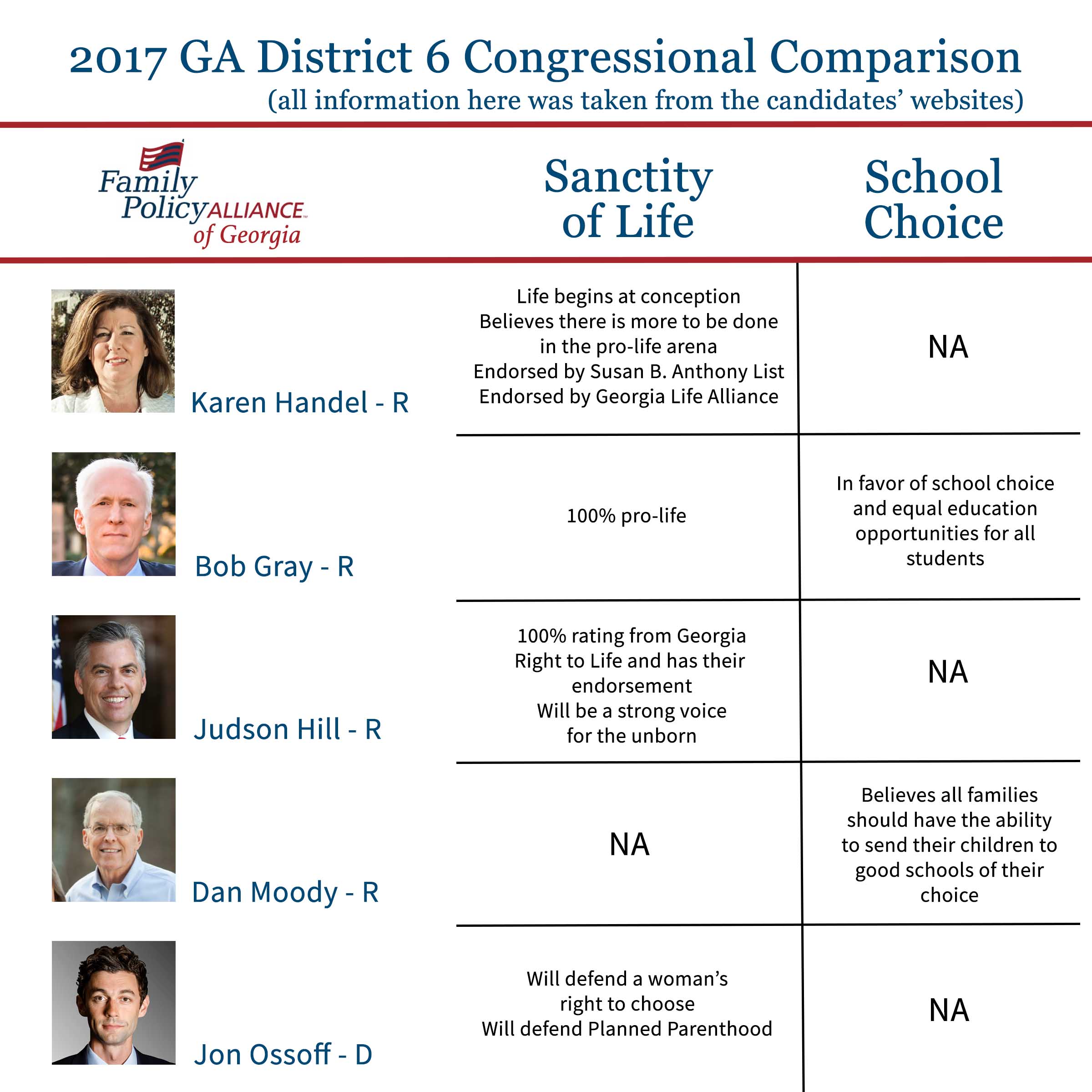 Meanwhile, conservatives have as many as four pro-family candidates mounting competitive campaigns. If this confusion leads voters to stay home on April 18 or on June 20 (the date of the runoff), we very well could see a radical liberal representing Tom Price’s former district. (See graphic above for where the candidates stand.)