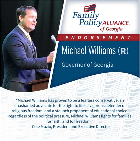 The race for governor is pivotal for the future of our state and for our nation, and we cannot afford to get this wrong. That’s why I am so excited to announce that Family Policy Alliance of Georgia has endorsed State Senator Michael Williams in his bid to lead our state.