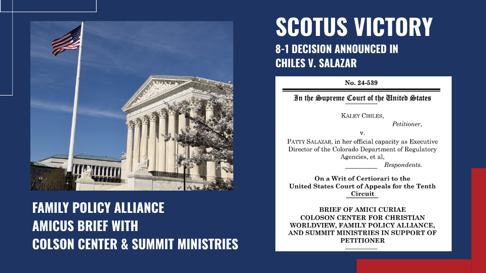 Since 2013, alongside our network of state Family Policy Councils, we have worked to oppose unconstitutional bans on talk therapy. In this case, we filed a key amicus brief with Summit Ministries and Colson Center in support of Kaley Chiles.