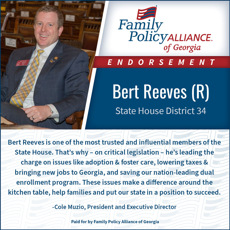 Bert Reeves is one of the most trusted and influential members of the State House. That’s why – on critical legislation – he’s leading the charge on issues like adoption and foster care, lowering taxes and bringing new jobs to Georgia, and saving our nation-leading dual enrollment program. These issues make a difference around the kitchen table, help families, and put our state in a position to succeed.