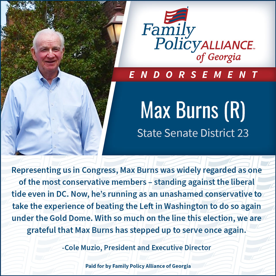 With so much on the line this election, we are grateful that Max Burns has stepped up to serve once again. Join us in electing this conservative leader to fight for us in Atlanta!