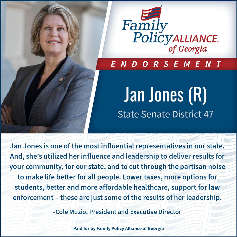 Jan Jones is a strong voice for Georgia, and her work to end human trafficking on the Grace Commission, stand for educational opportunity, and provide for safe communities for every family is making a big difference in our state.