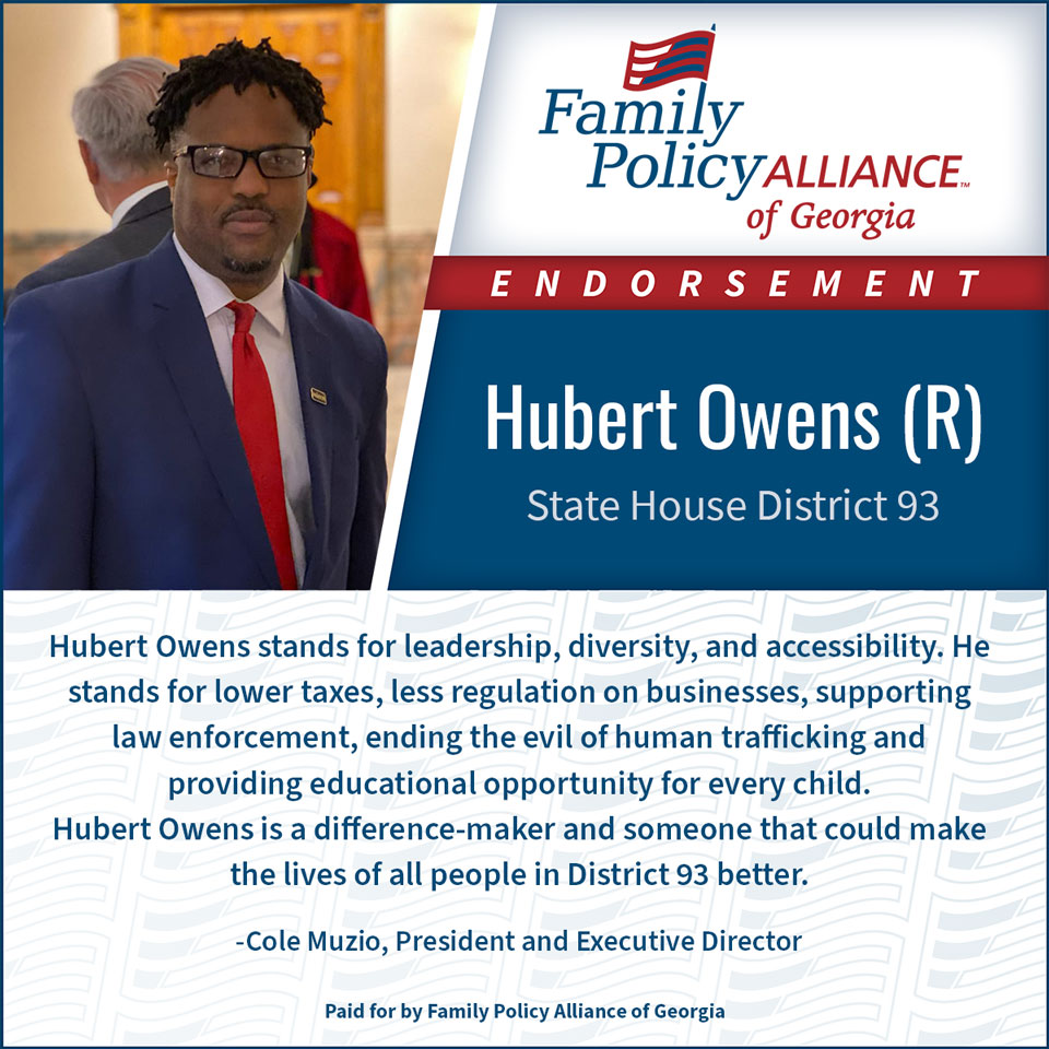 We’re asking you to use your choice to support Hubert Owens. He stands for leadership, diversity, and accessibility. He stands for lower taxes, less regulation on businesses, supporting law enforcement, ending the evil of human trafficking, and providing educational opportunity for every child.