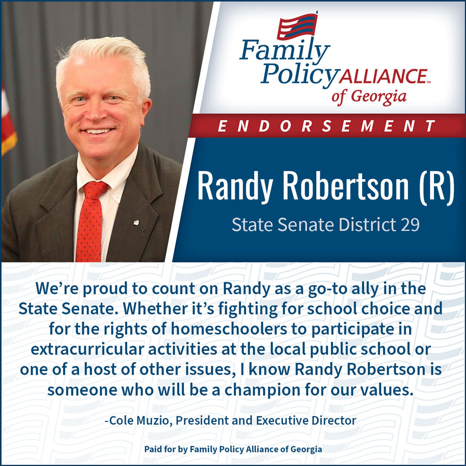 We’re proud to count on Randy as a go-to ally in the State Senate. Whether it’s fighting for school choice and for the rights of homeschoolers to participate in extracurricular activities at the local public school or one of a host of other issues, I know Randy Robertson is someone who will be a champion for our values.