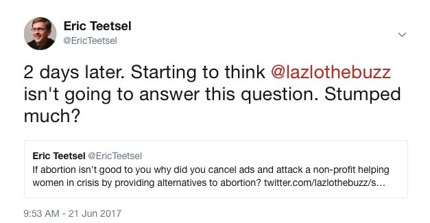There is a paradox here. Lazlo thinks so much of abortion that he forces his station to terminate a marketing contract with a crisis pregnancy center and then invites a Planned Parenthood executive on air to spread lies and misinformation about the work of CPCs, while promoting their abortion business.